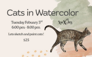 🐾 Cats in Watercolor Led by Oksana | $25 | Limited Seating Calling all cat lovers and creatives! 🐱 Join Oksana for a fun and relaxed watercolor class where we’ll sketch and paint charming cats. Learn simple techniques for capturing personality and texture through watercolor — whether it’s your own furry friend or a reference provided in class. You’re welcome to bring photos of your own cat to use as inspiration! This smaller, hands-on class ensures plenty of personal attention and creative guidance. ✨…