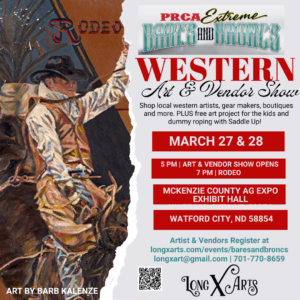 Featuring local artists and vendors showing and selling their work during the PRCA Extreme Bares and Broncs Rodeo Friday March 27, 2026 Saturday March 28, 2026 5-10 pm McKenzie County Ag Expo Watford City, ND   Artists and Vendors! Show your art and products at the rodeo! Rodeo is big in Watford City and the McKenzie County Ag Expo is a great place to take it all in. Artists and vendors, show and sell your work during two evenings of…