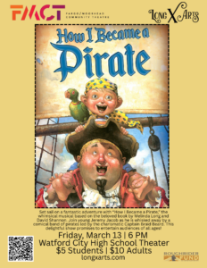 THEATRE FOR YOUNG AUDIENCES COMMUNITY PERFORMANCE Friday, March 13 6:00 PM | Show Watford City High School Theater $5 Students | $10 Adults Tickets available at the door Set sail on a fantastic adventure with “How I Became a Pirate,” the whimsical musical based on the beloved book by Melinda Long and David Shannon. Join young Jeremy Jacob as he is whisked away by a comical band of pirates led by the charismatic Captain Braid Beard. Together, they embark on…